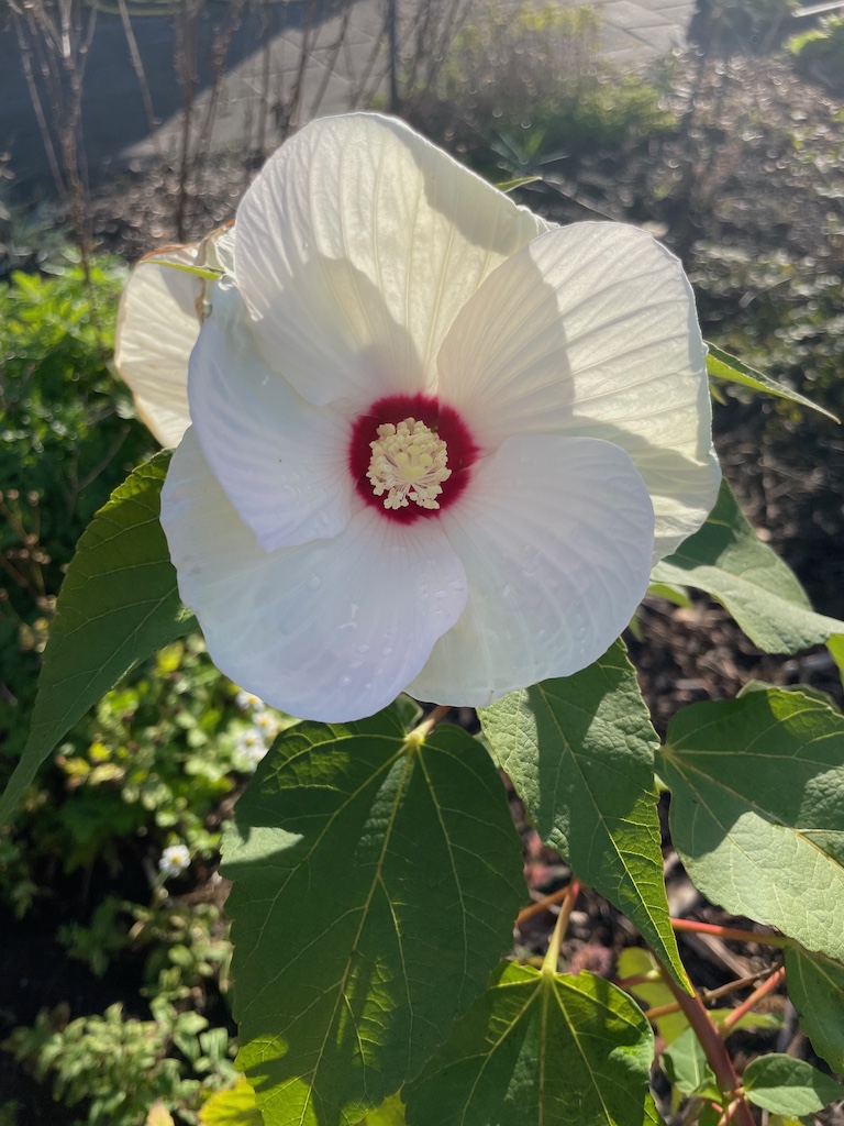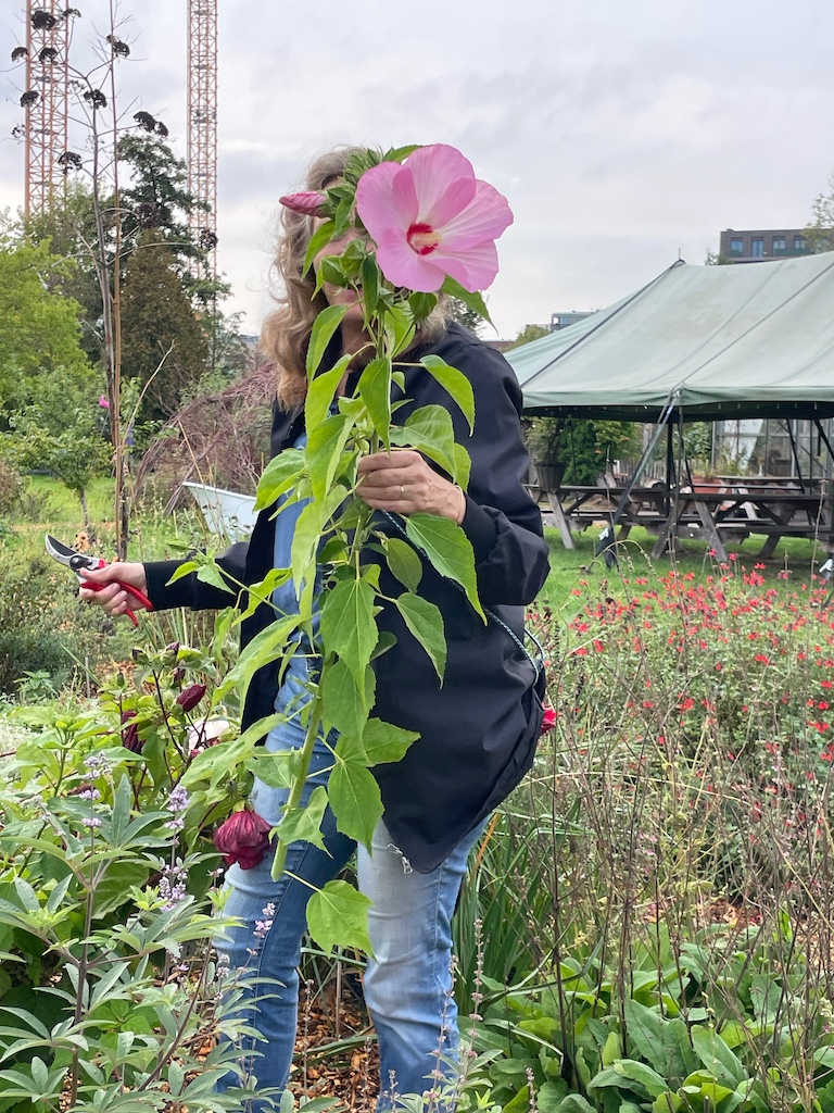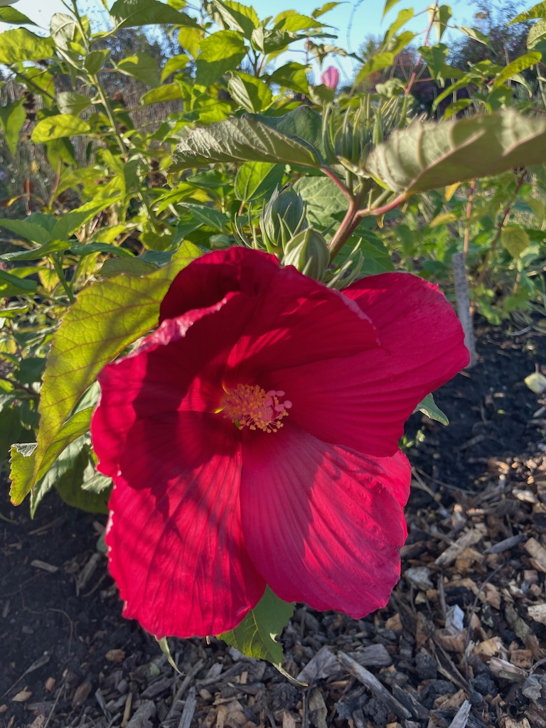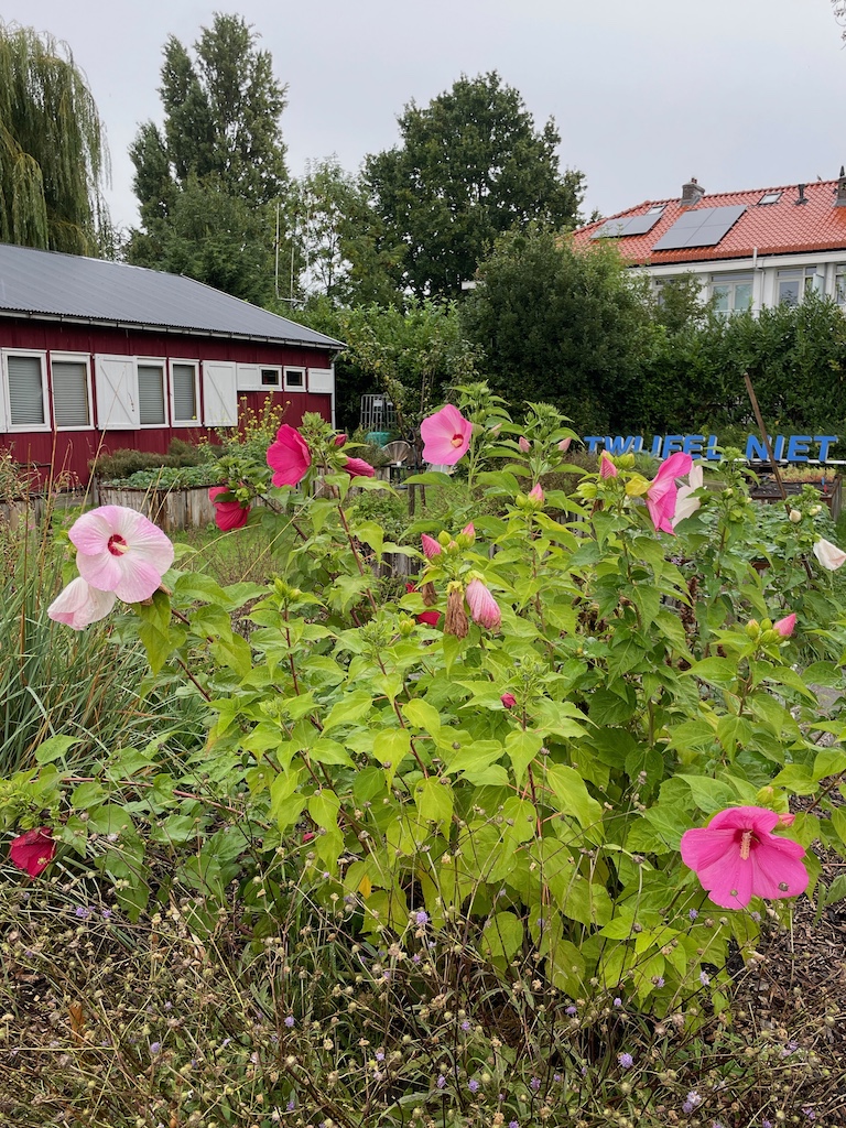 Deze Hibiscus met zeer grote bloemen sterft elk najaar af om het volgende voorjaar weer (laat) op te komen. Zorg voor niet al te natte grond in de winter en een zonnige plaats in de tuin.